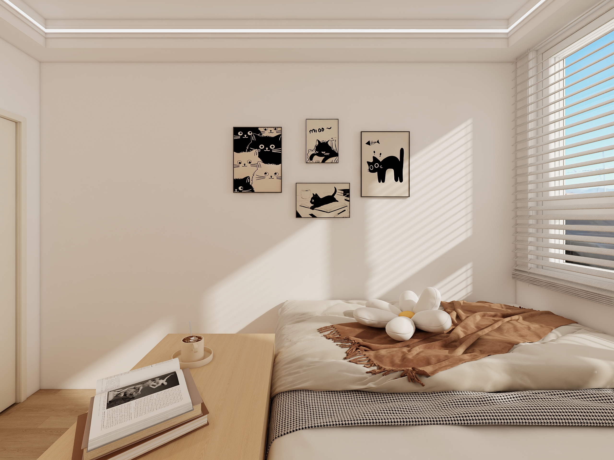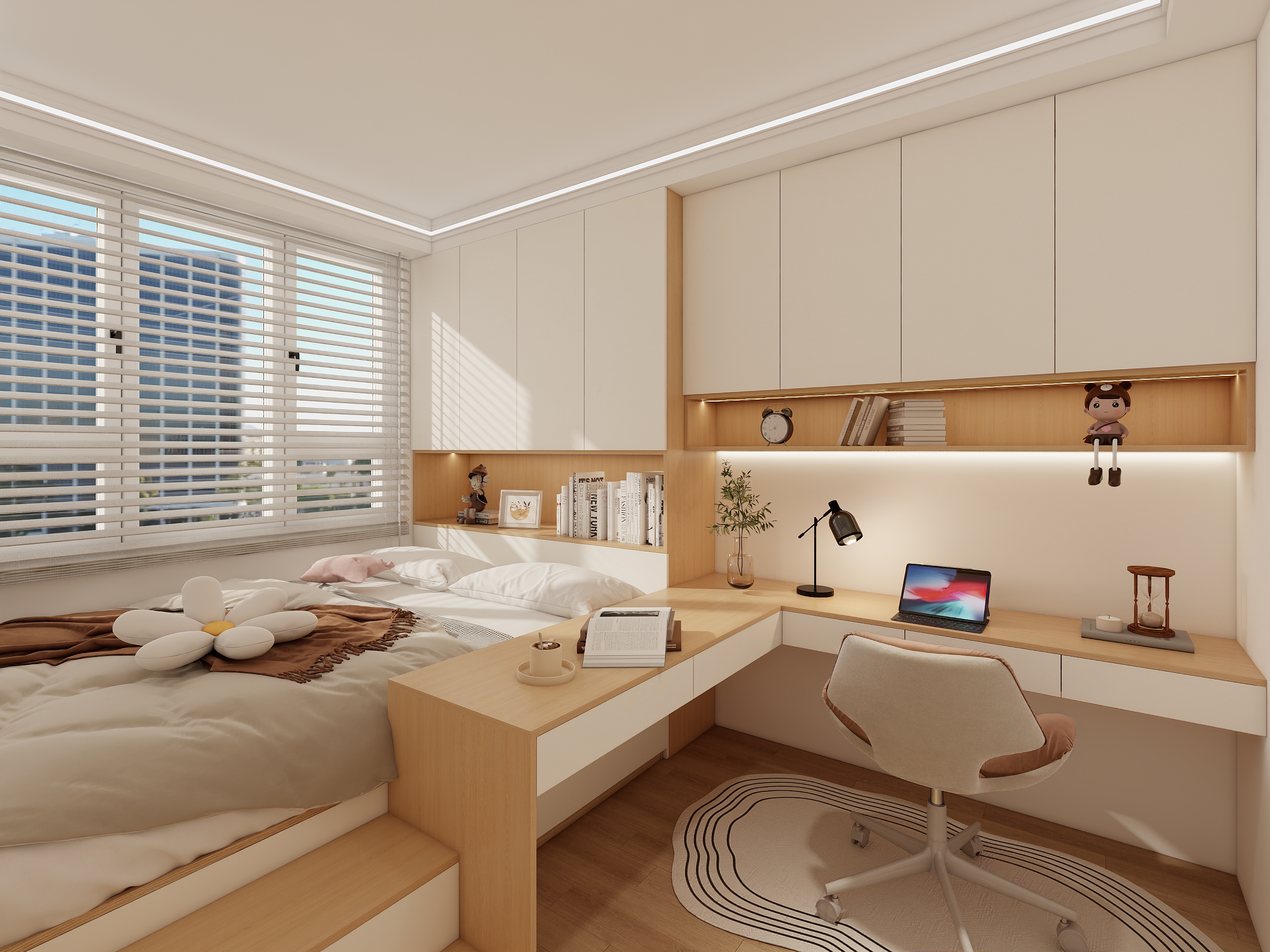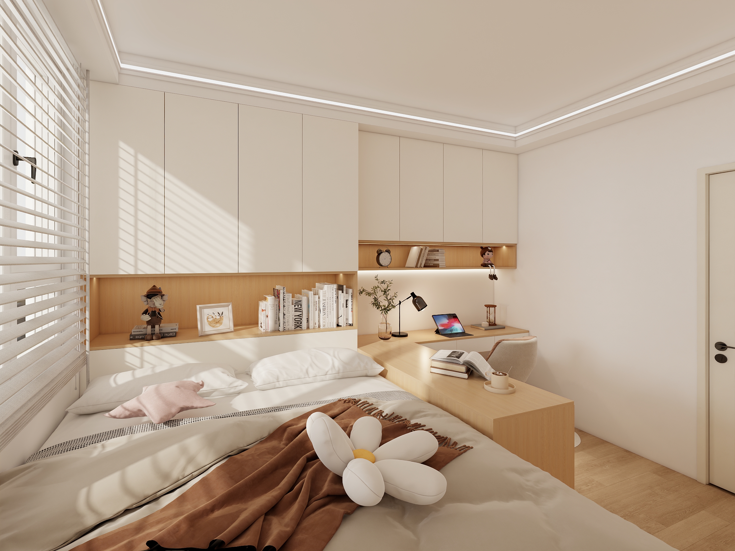 Transform your space with X-Bond’s multifunctional bedroom, featuring a built-in study desk with pegboard organizer, white wardrobe storage, and neutral bedding with black accents. Includes abstract wall art, natural light optimization, and space-saving solutions for urban living.
