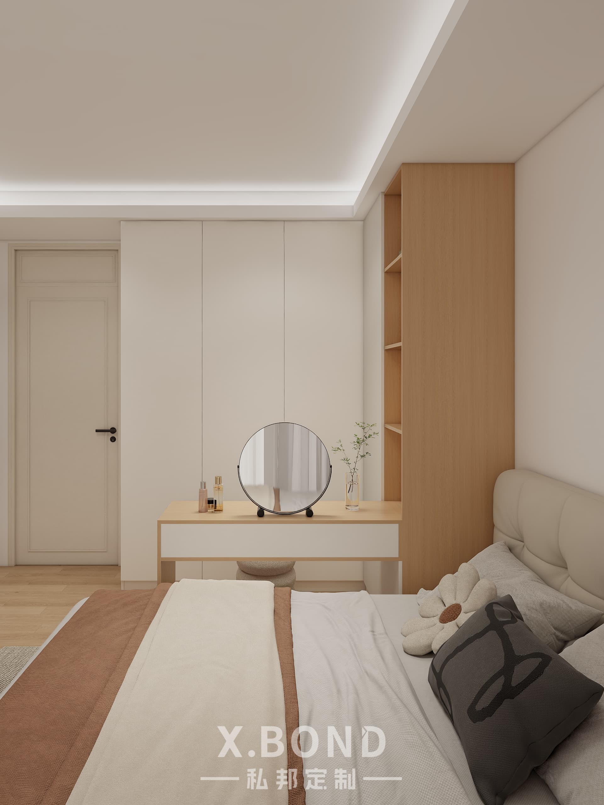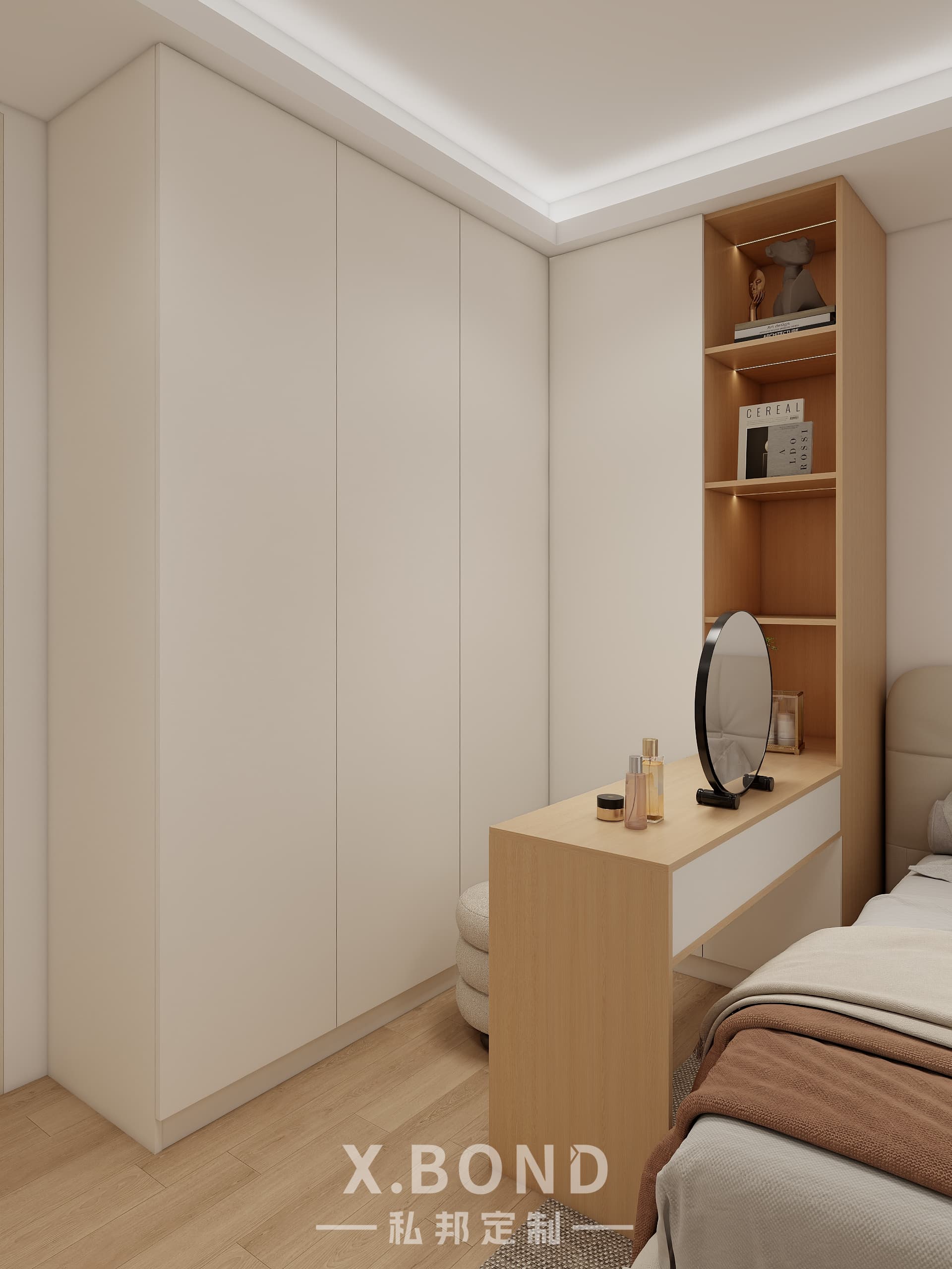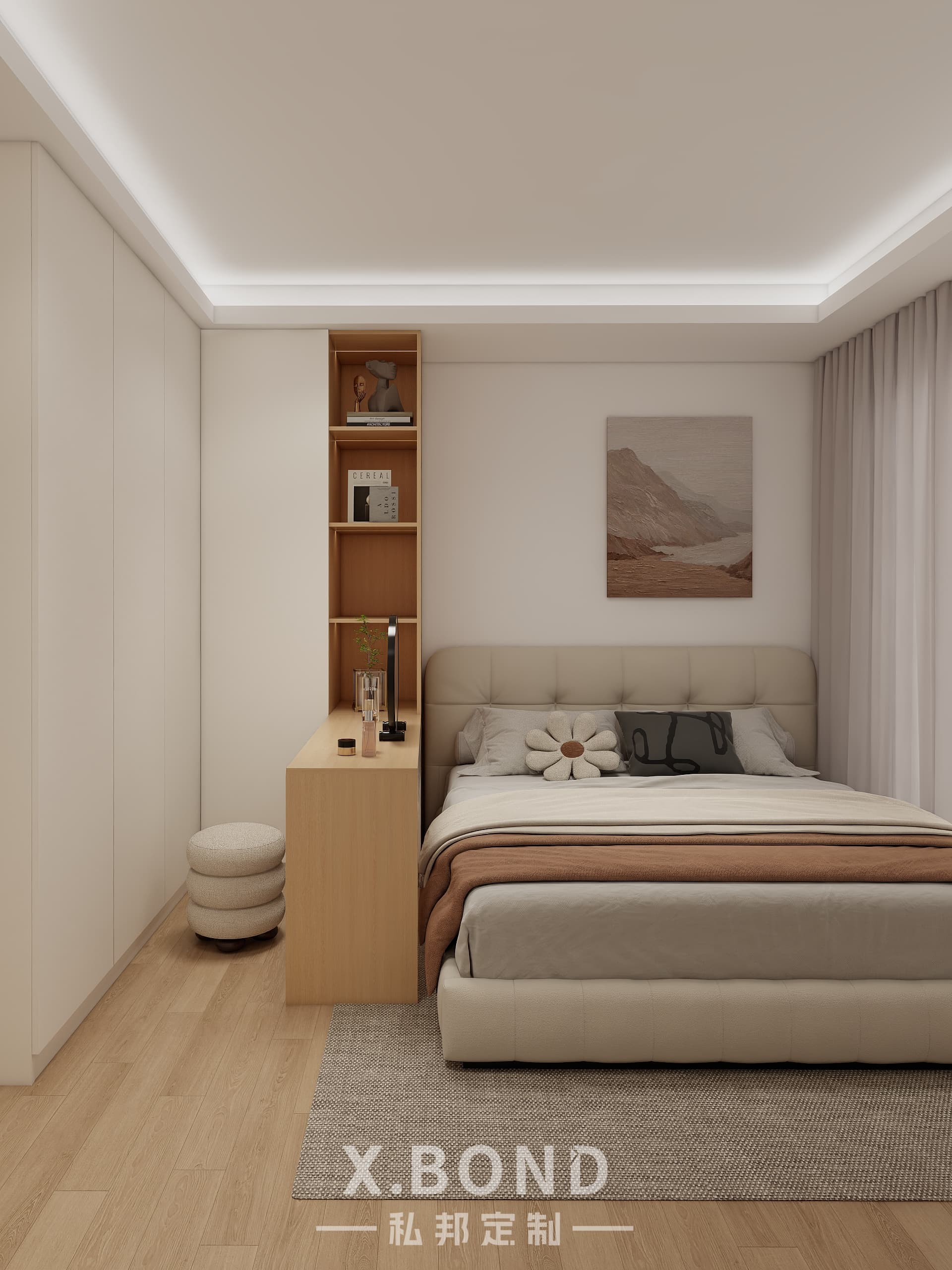 This Singapore master bedroom by X.BOND embodies modern minimalism with a neutral palette of light wood and matte white surfaces. Features include a built-in wardrobe system, floating workspace with integrated shelving, and recessed ambient lighting. The design prioritizes clean lines and spatial efficiency while maintaining warmth through natural textures.