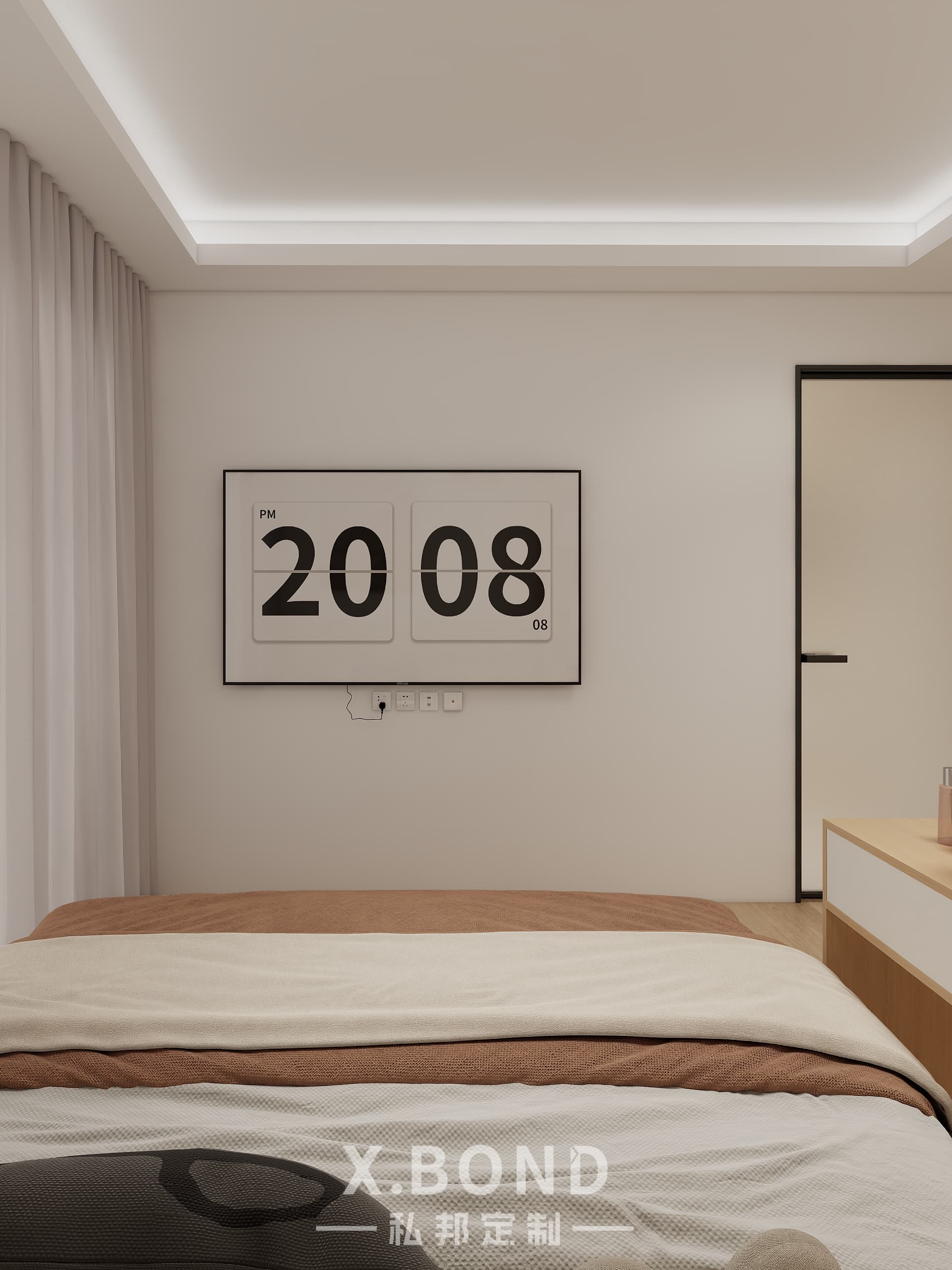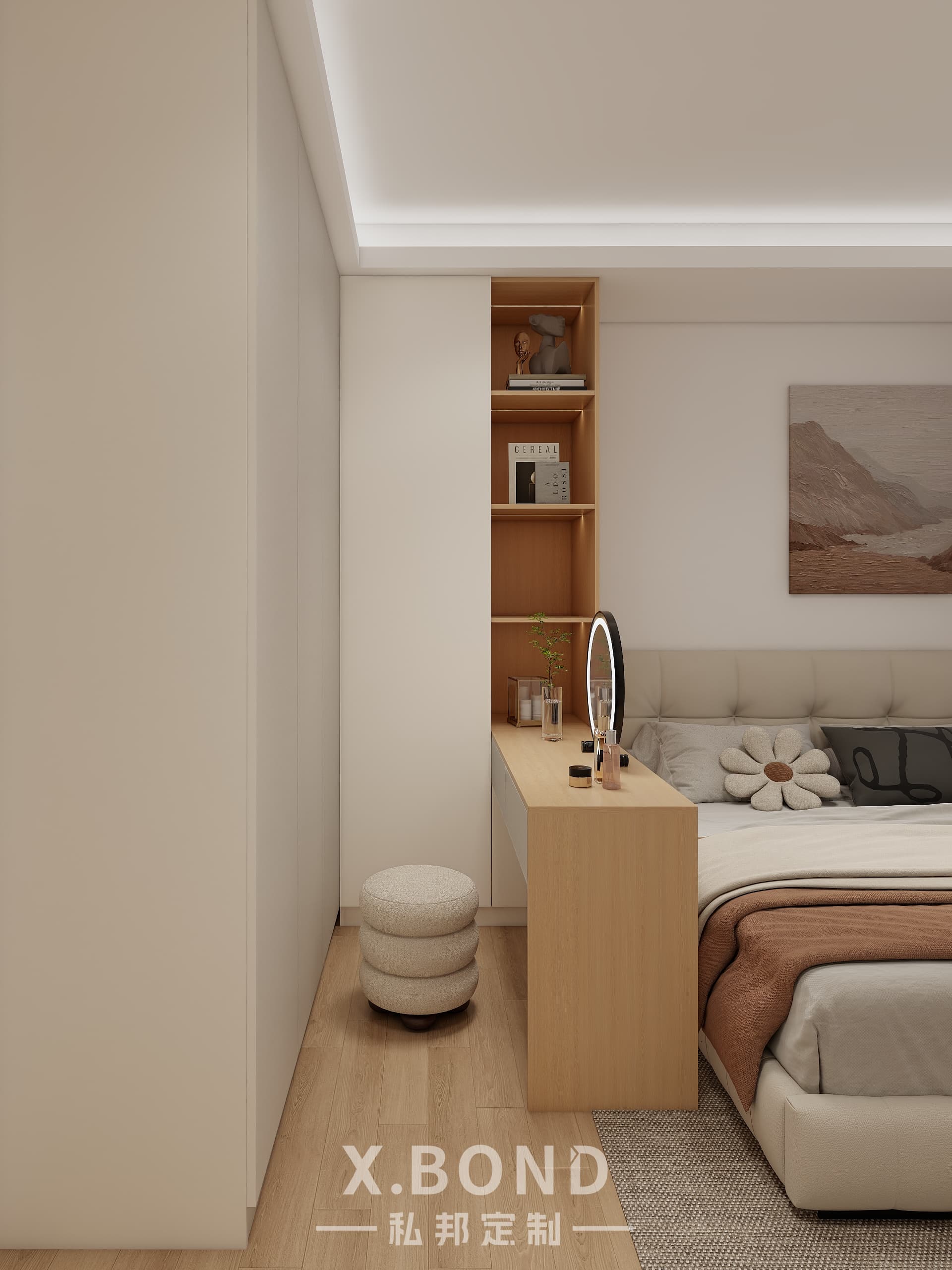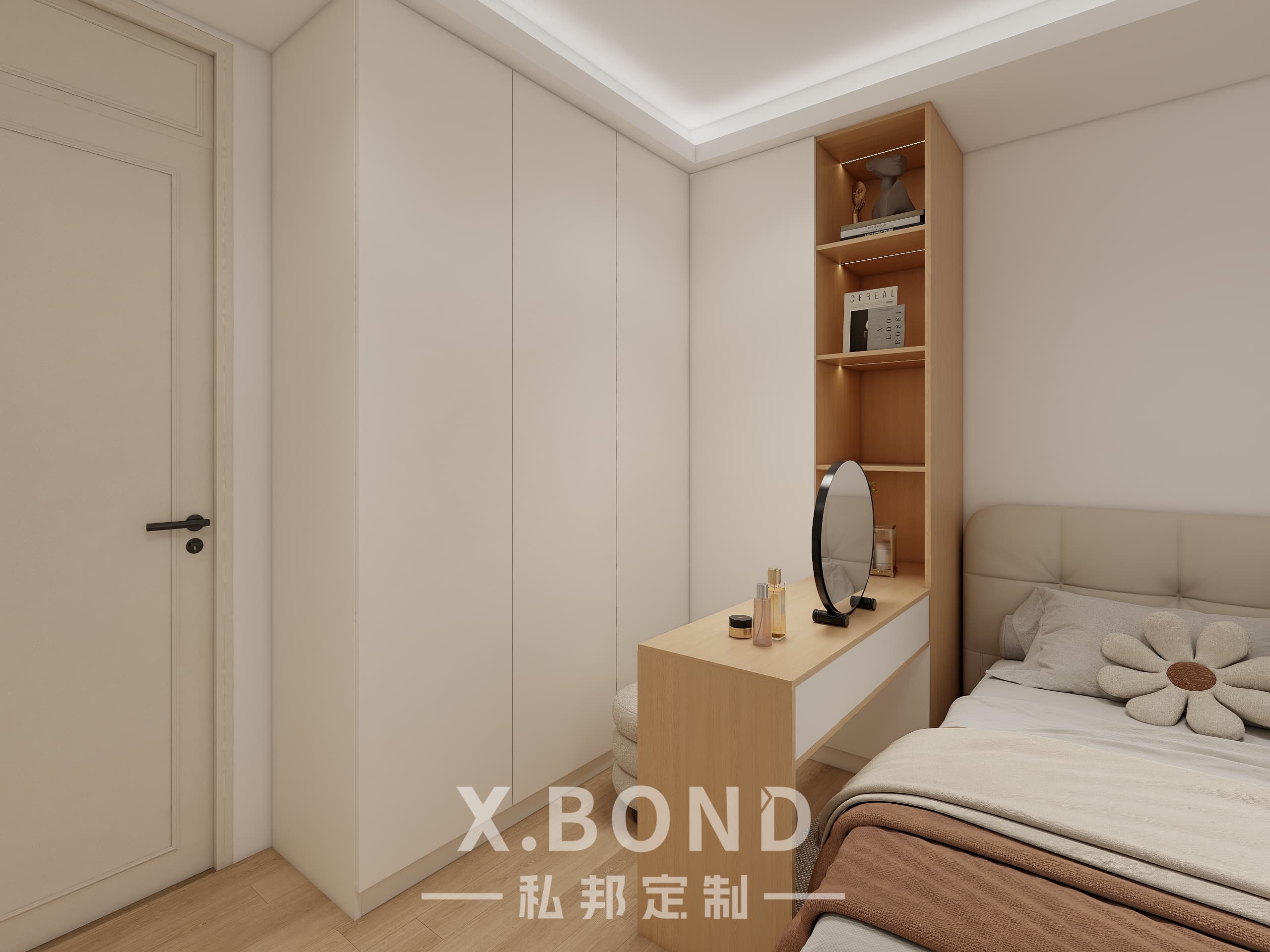 This Singapore master bedroom by X.BOND embodies modern minimalism with a neutral palette of light wood and matte white surfaces. Features include a built-in wardrobe system, floating workspace with integrated shelving, and recessed ambient lighting. The design prioritizes clean lines and spatial efficiency while maintaining warmth through natural textures.