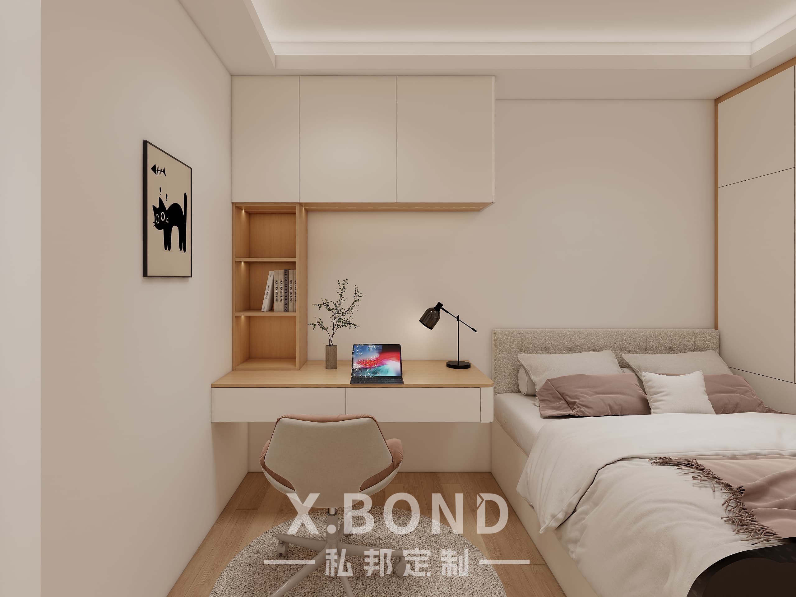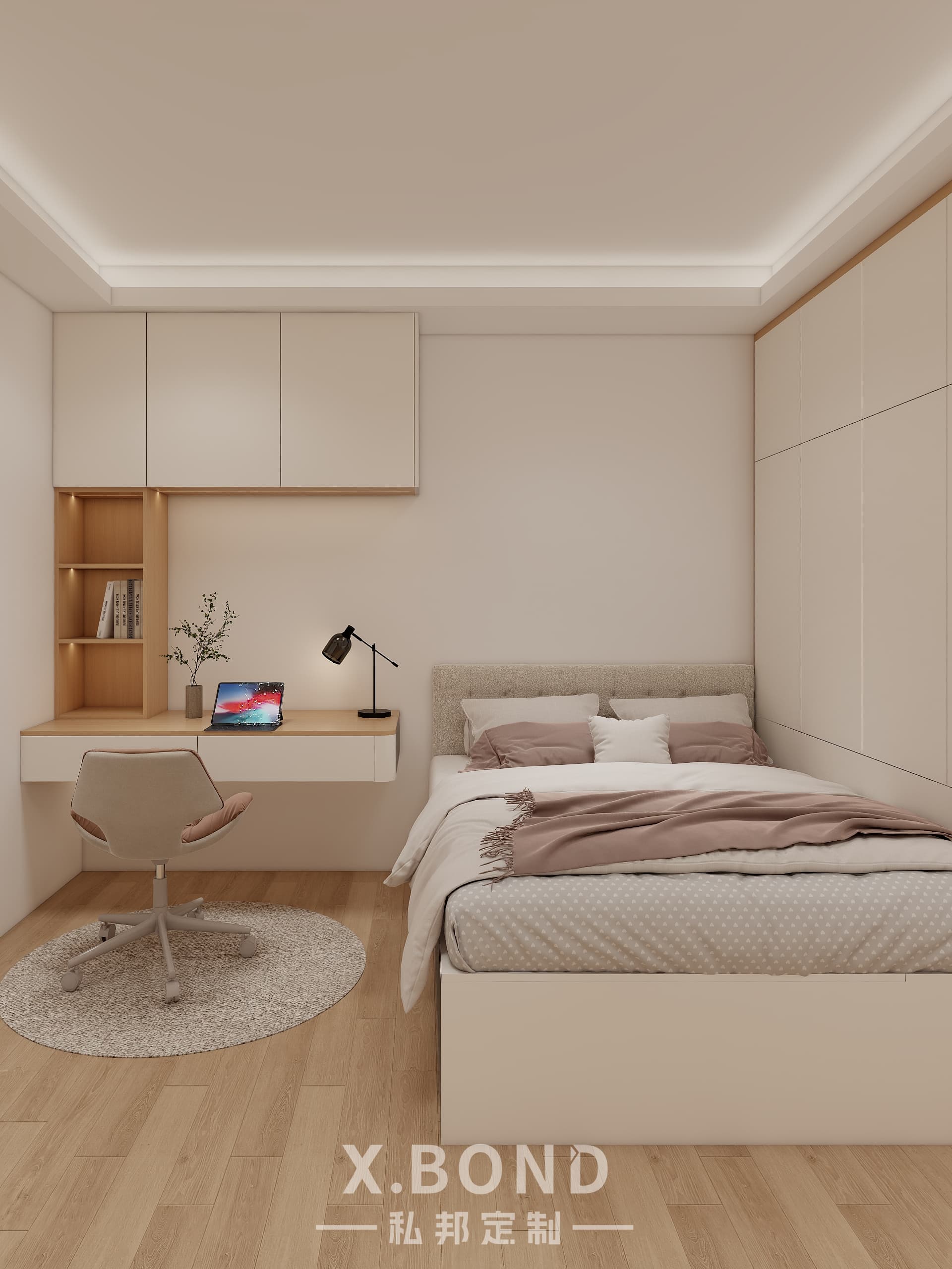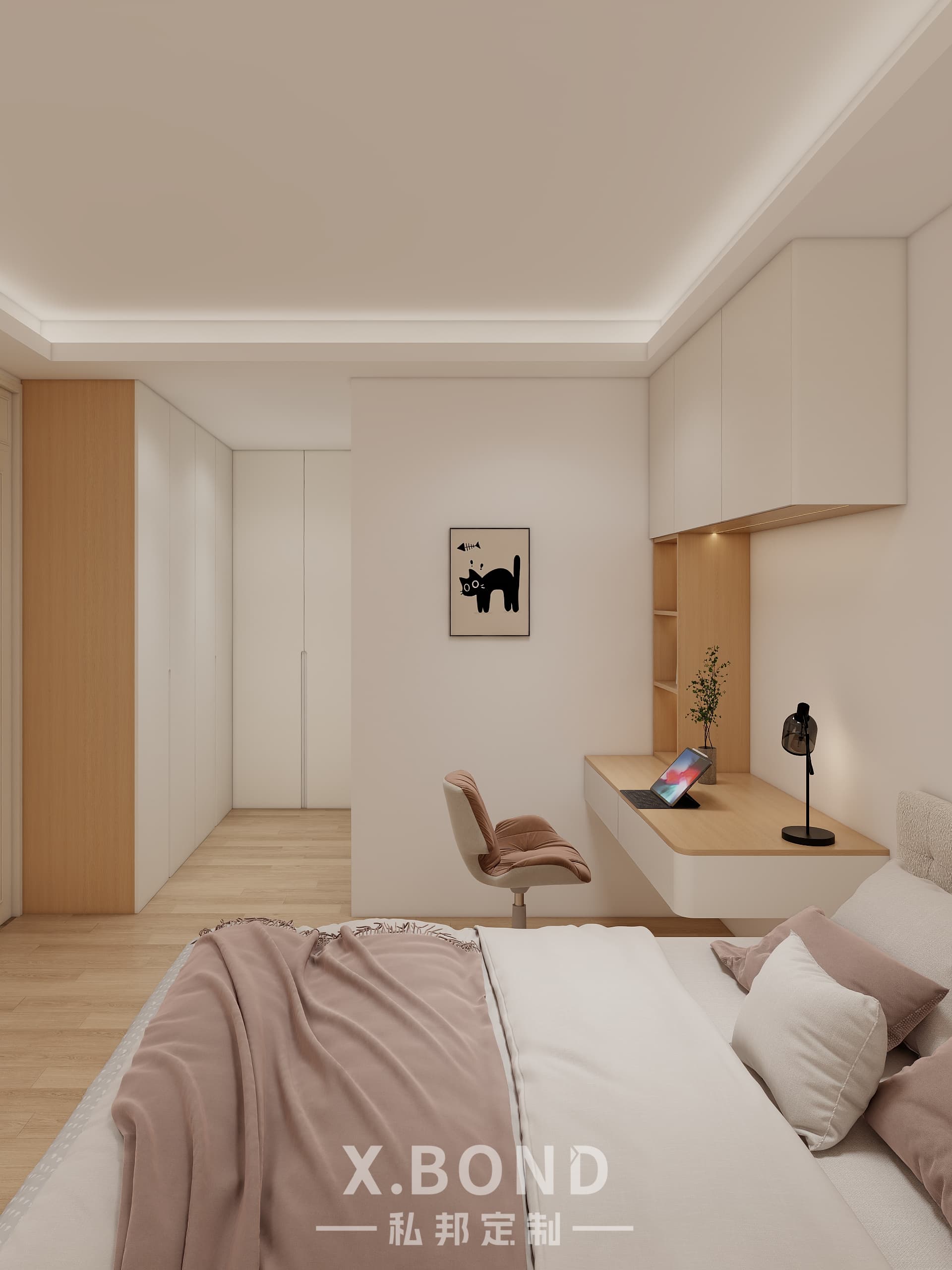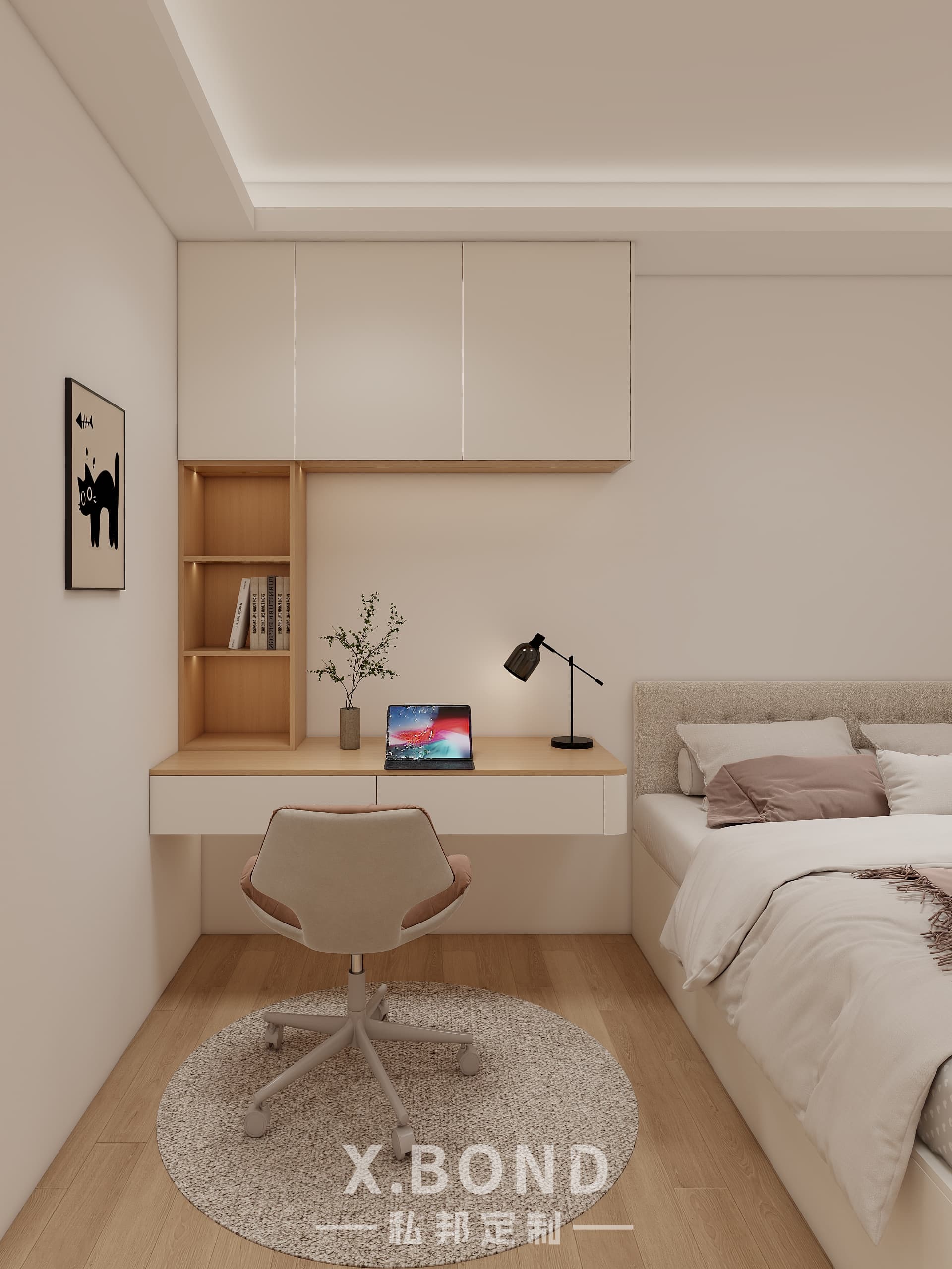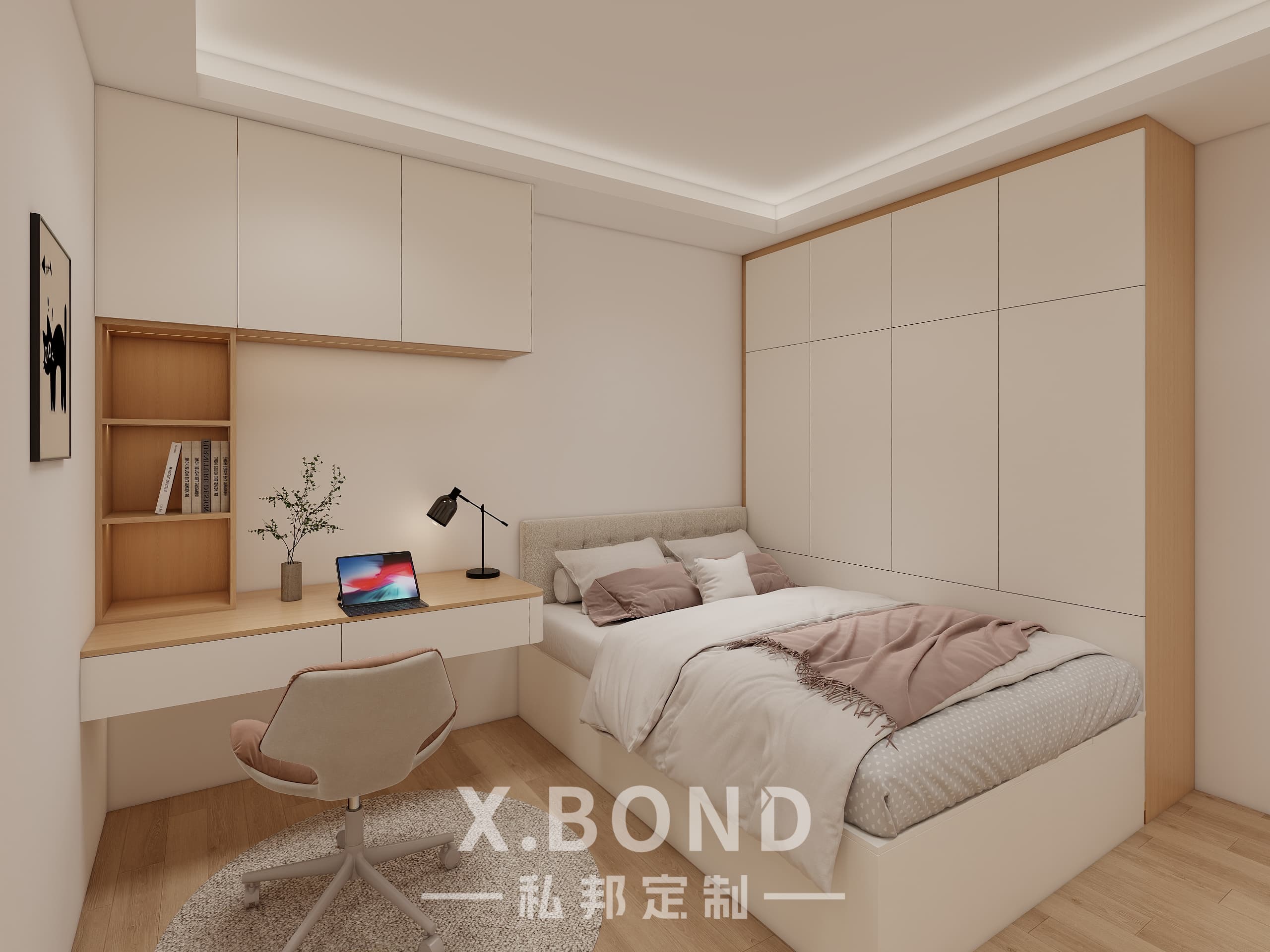 A study in Singaporean space optimization, this X.BOND-designed bedroom combines modular cabinetry with a monochrome base (white/black/wood). Highlights include concealed storage systems, ergonomic floating workstations, and strategic lighting layers for day-night adaptability.