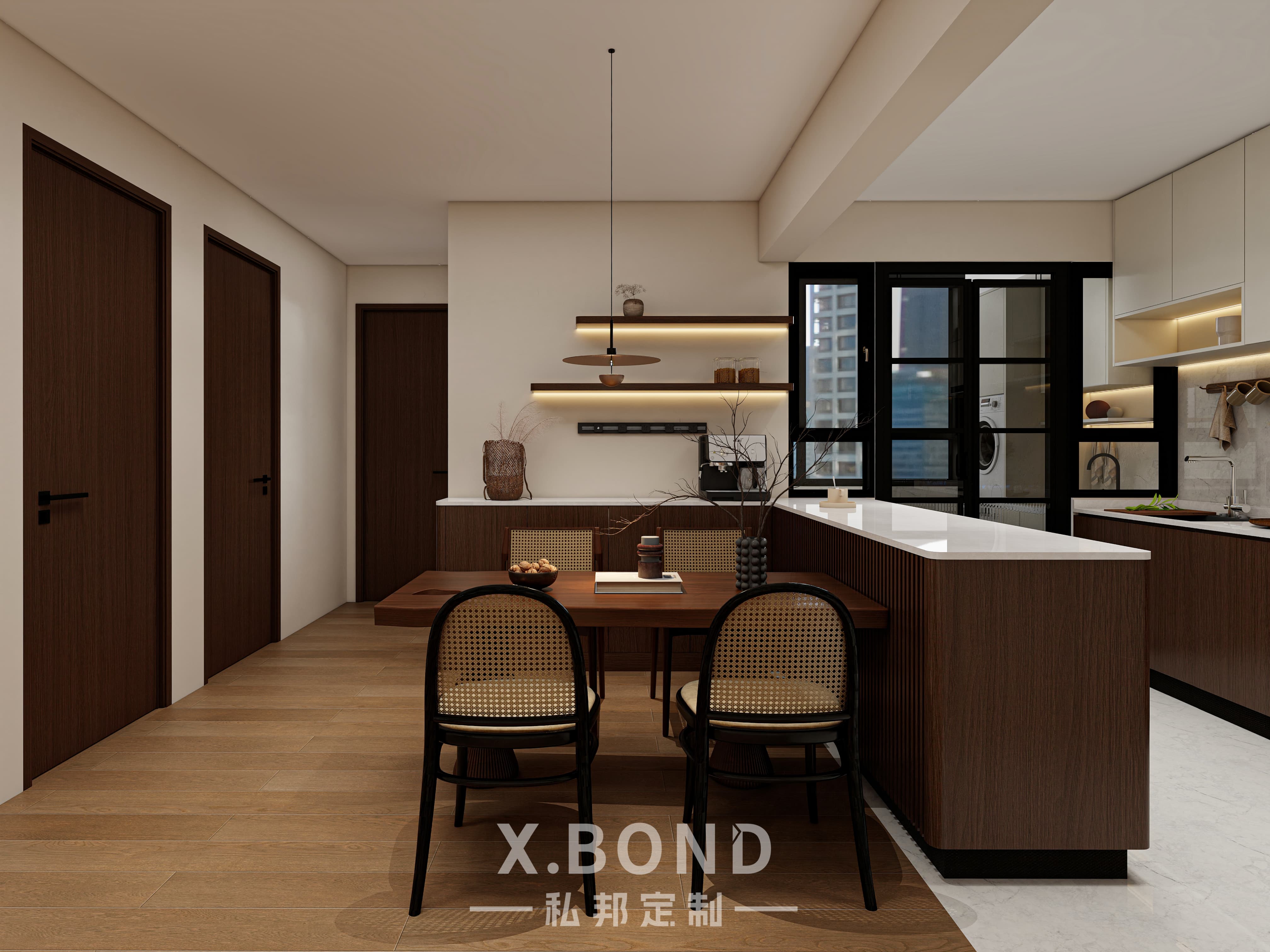 This 4-room HDB showcases a warm mid-century cream aesthetic. It features soft neutral tones, rich wood accents, and custom X.BOND cabinetry. The design seamlessly connects the living area, kitchen, and bedrooms, creating a cozy, timeless home with a harmonious and inviting atmosphere.