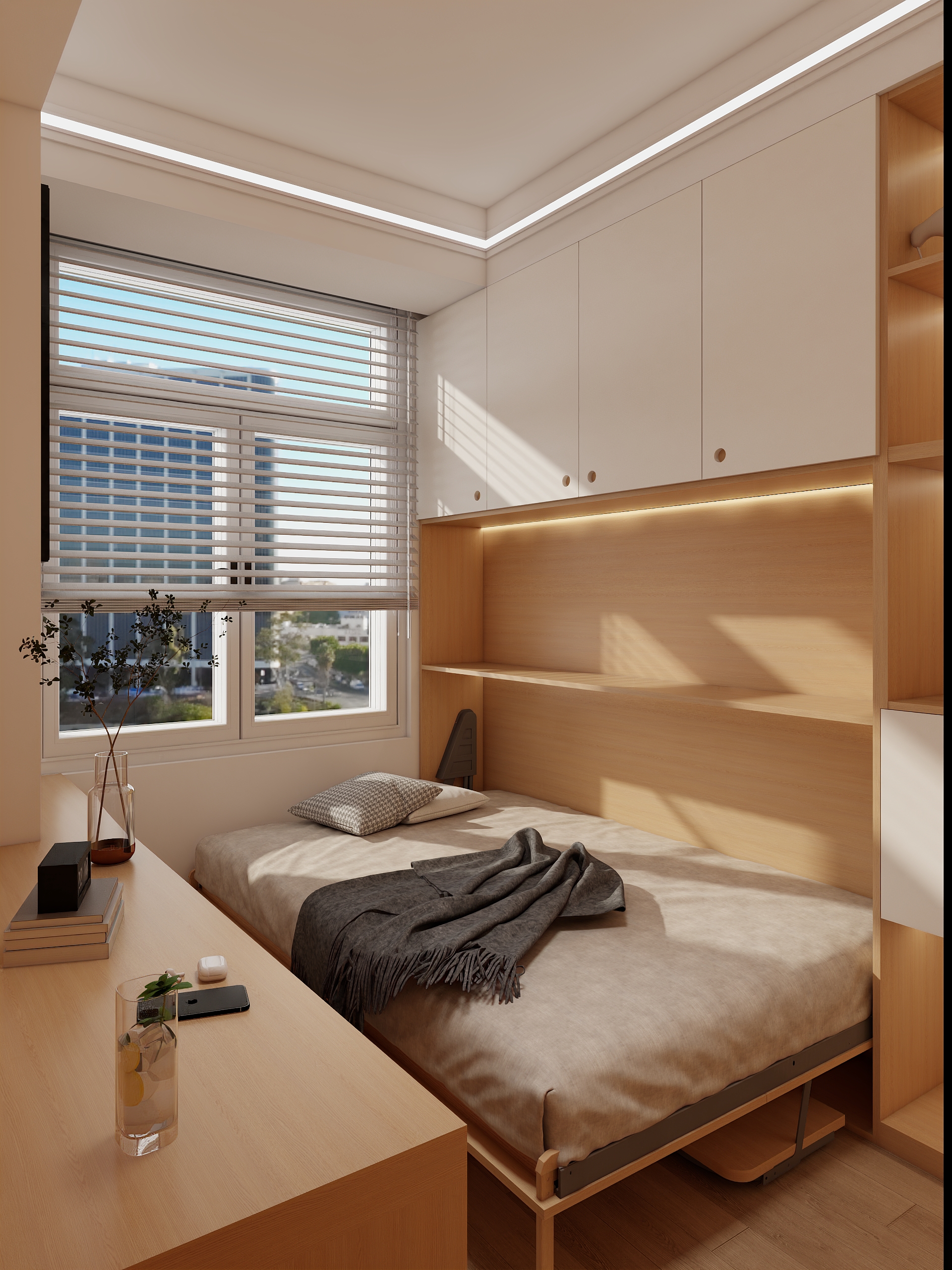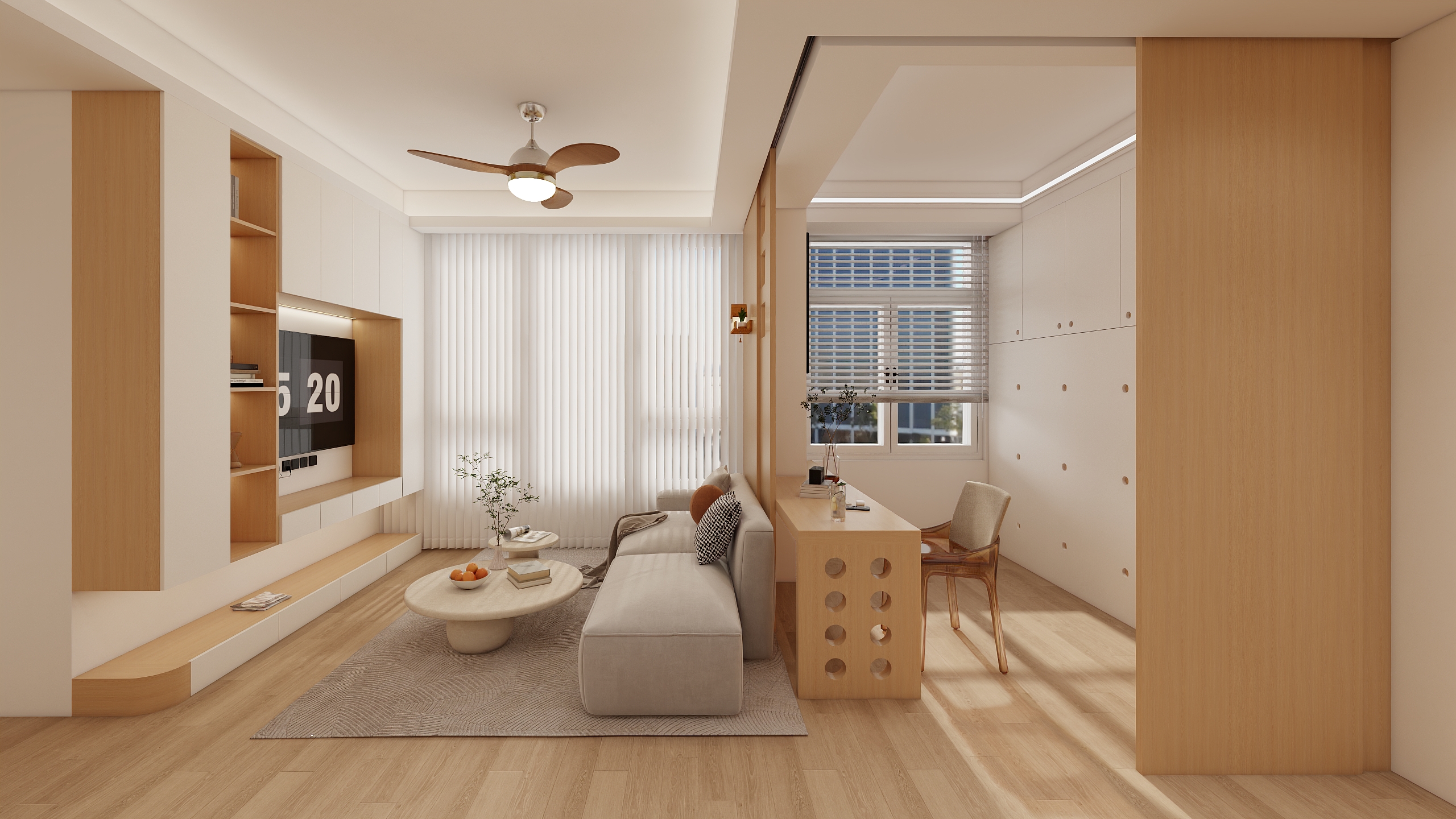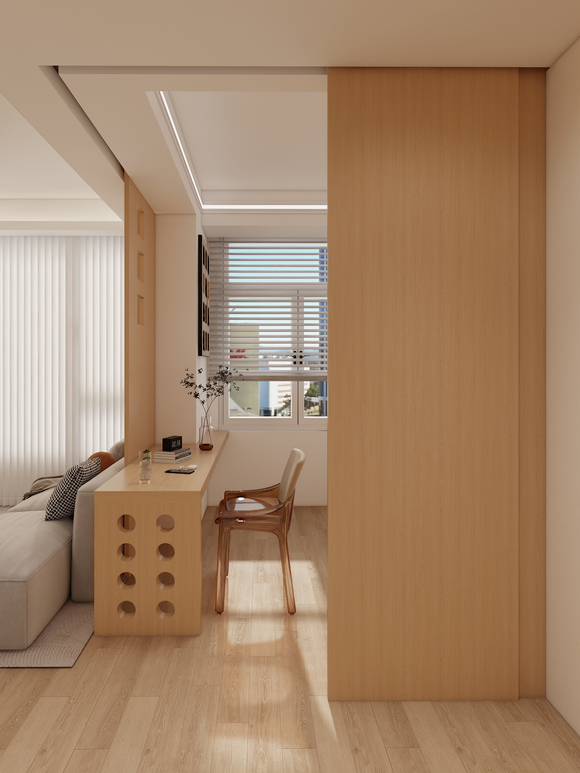 Upgrade your home office with X-Bond’s sleek wooden writing desk and multi-functional storage console, featuring acrylic leg supports, glass-front display cabinets, and open wooden shelves. Includes ergonomic white chair, built-in wardrobe integration, and neutral-toned decor for a productive ambiance.