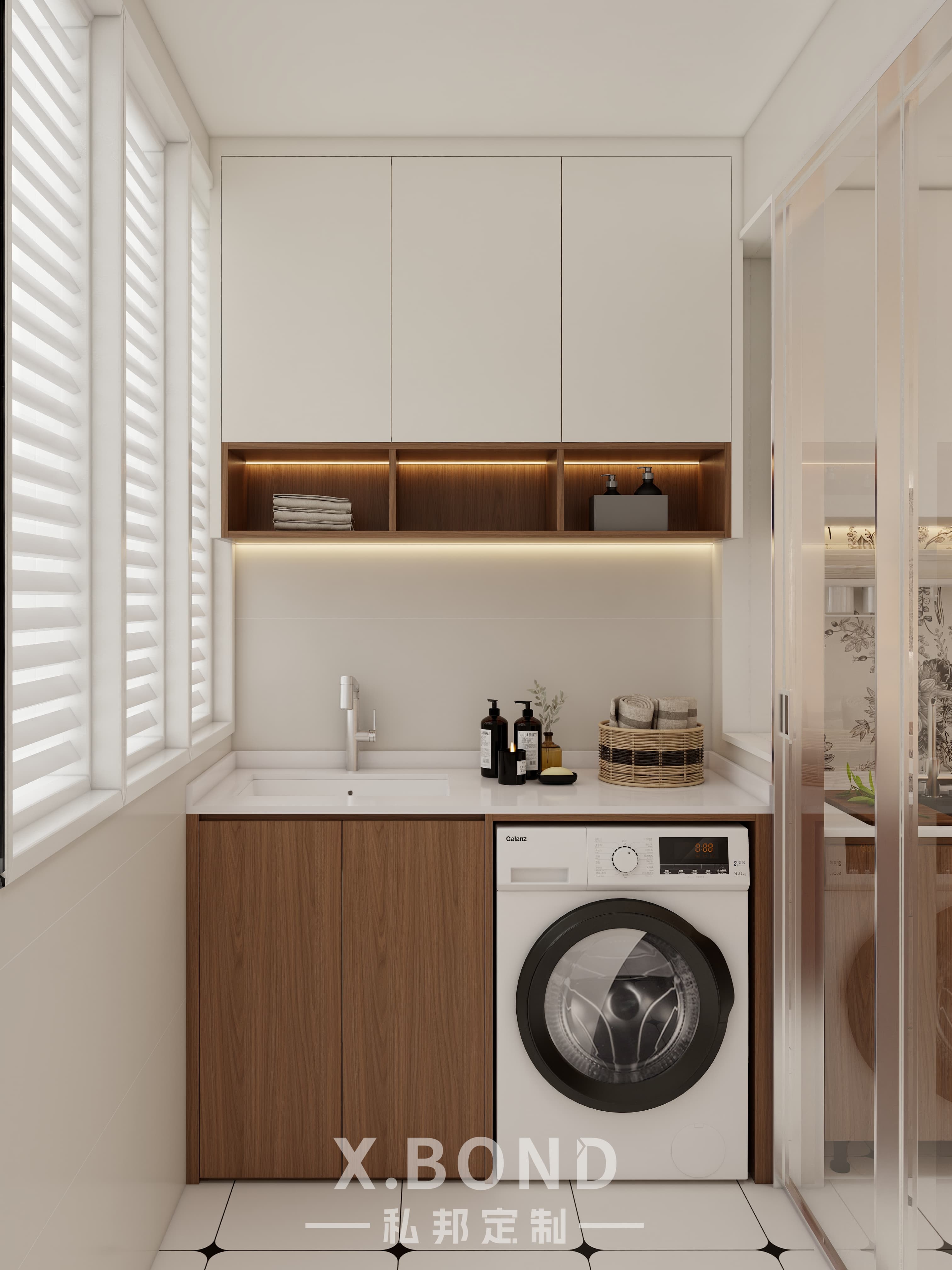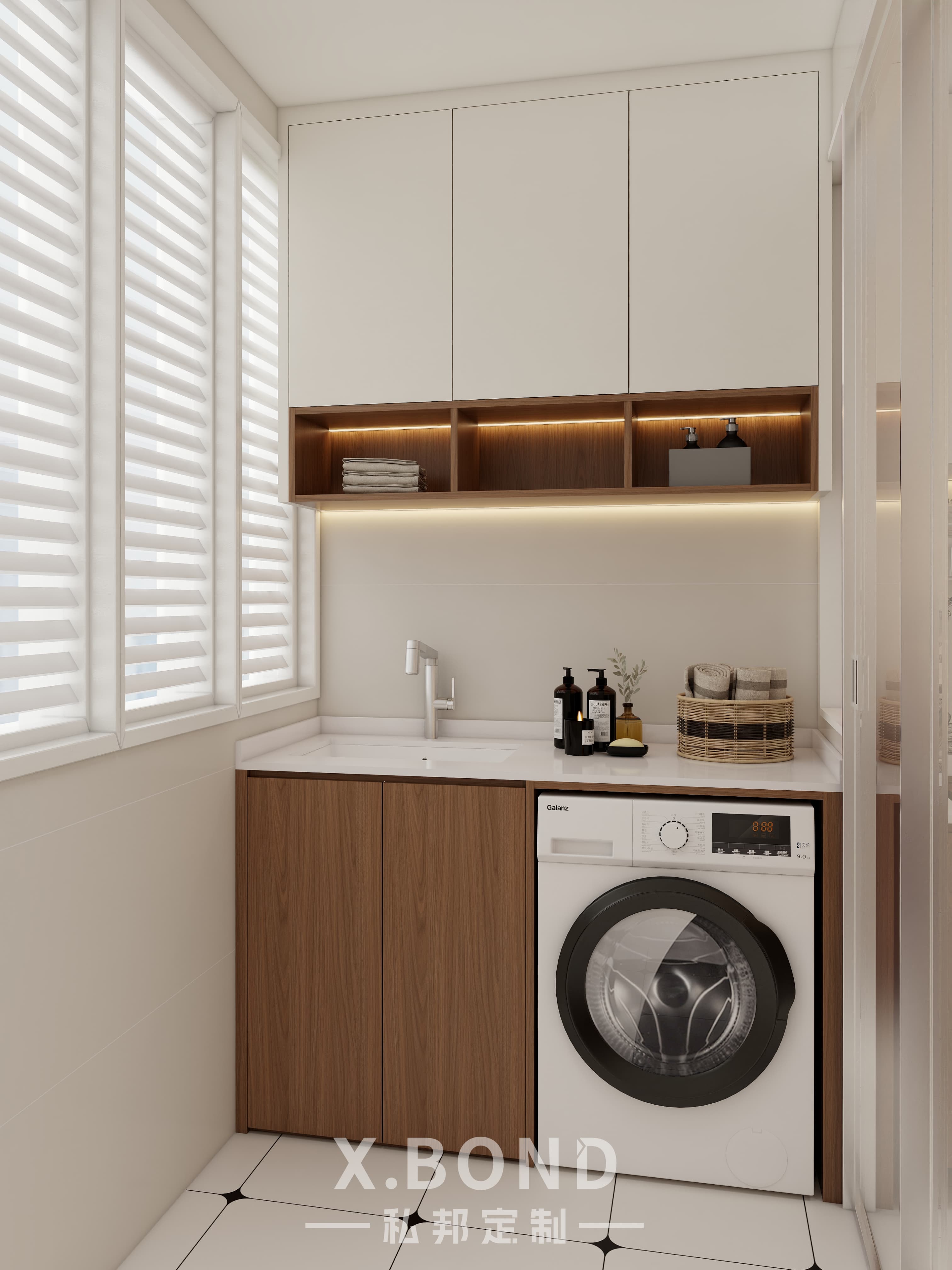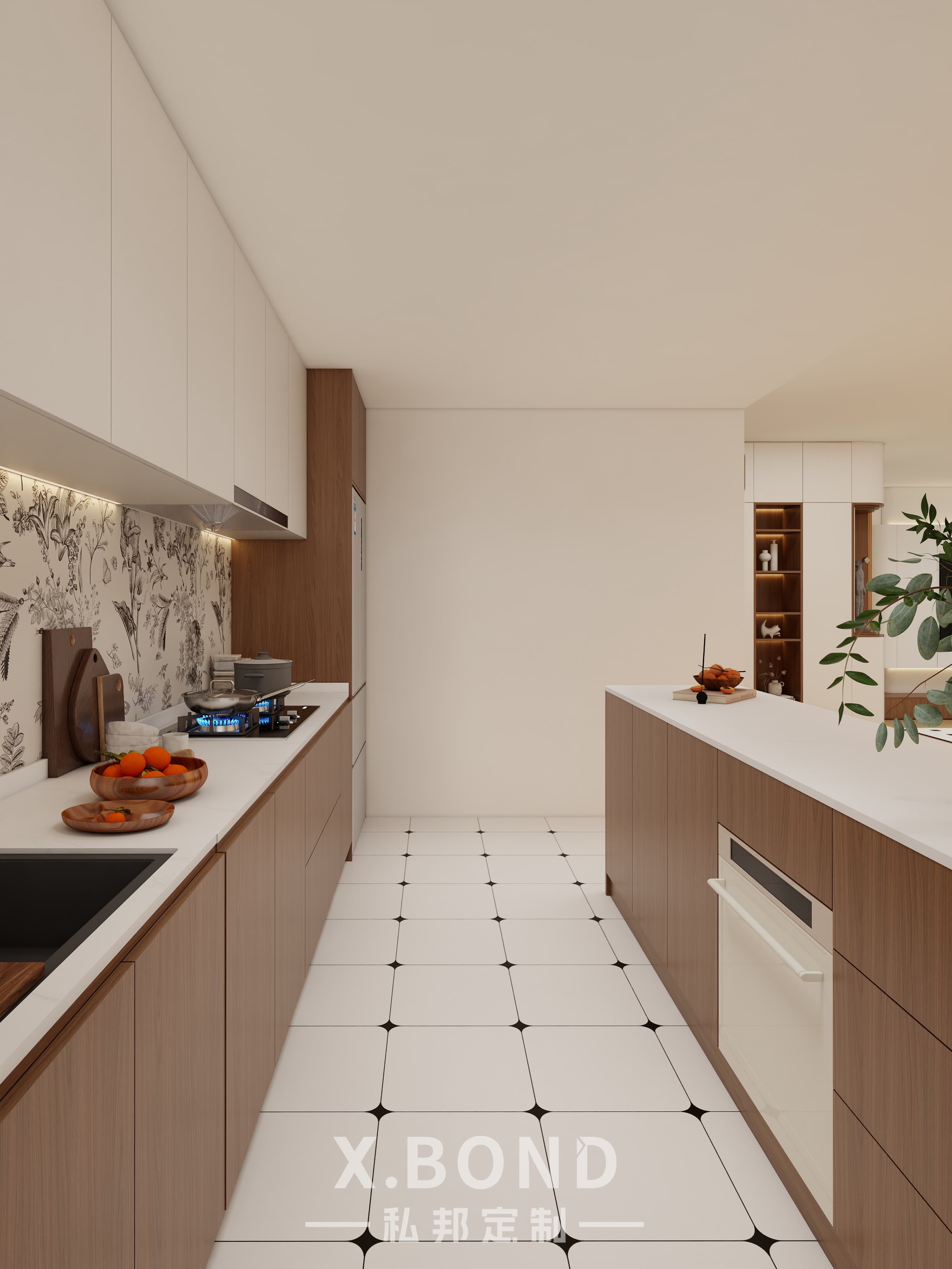 This sleek Singaporean kitchen blends minimalist white cabinetry with soft blue lower cabinets and warm wood countertops. Features include a ROBAM oven, gas stovetop, hanging utensil rack, and diamond-patterned flooring. Open shelving displays spices, while a glass door floods the space with natural light.
