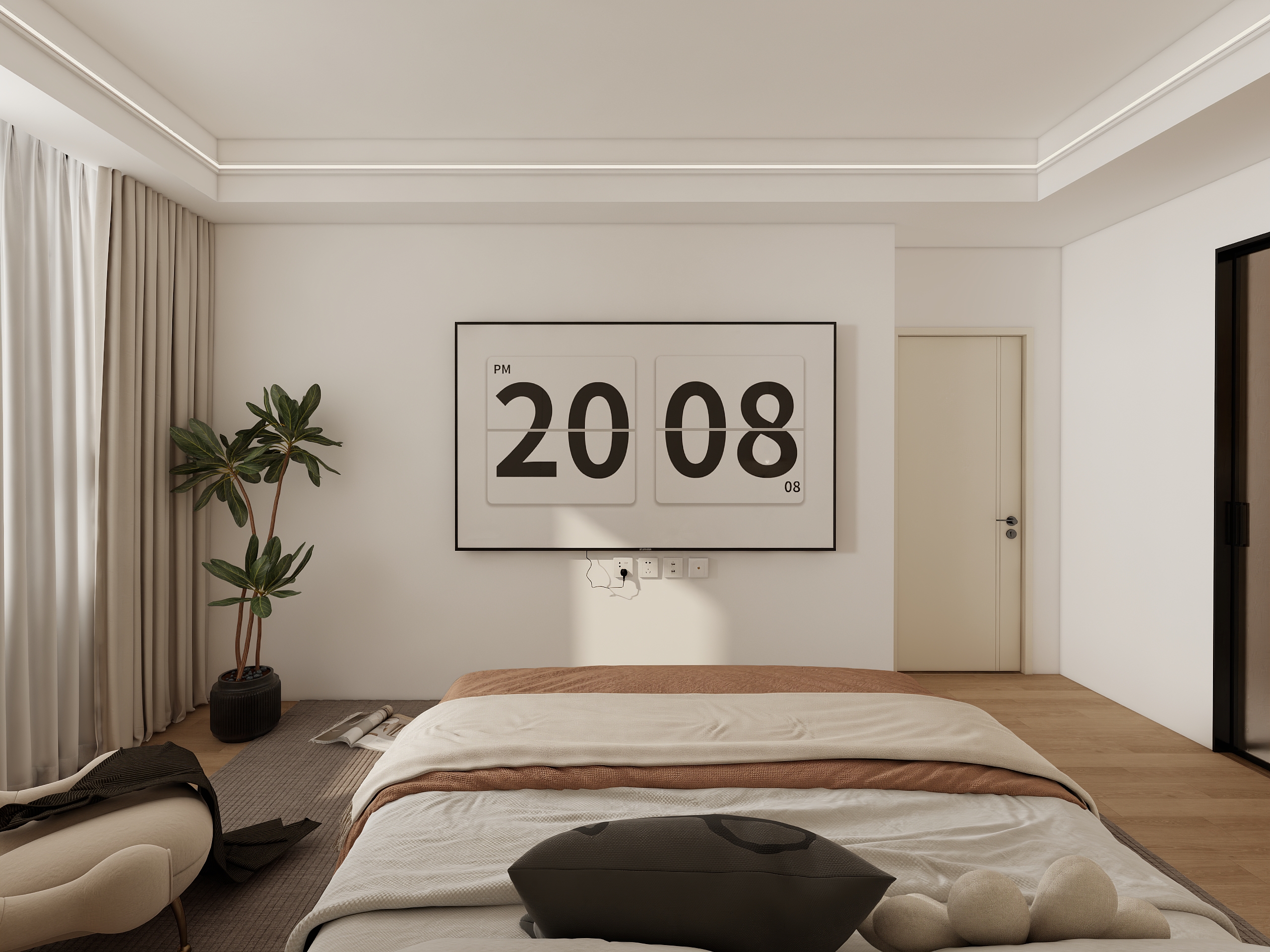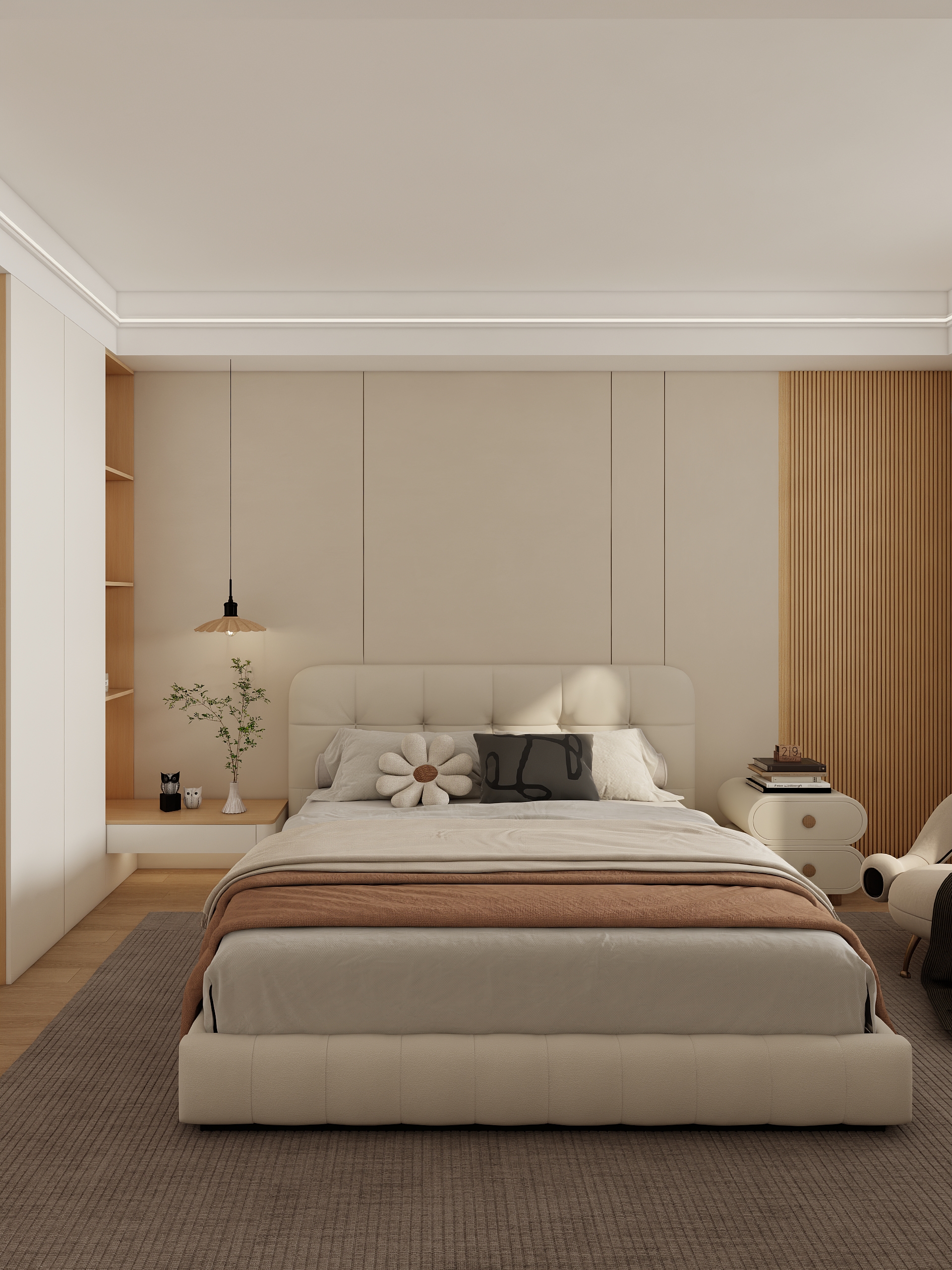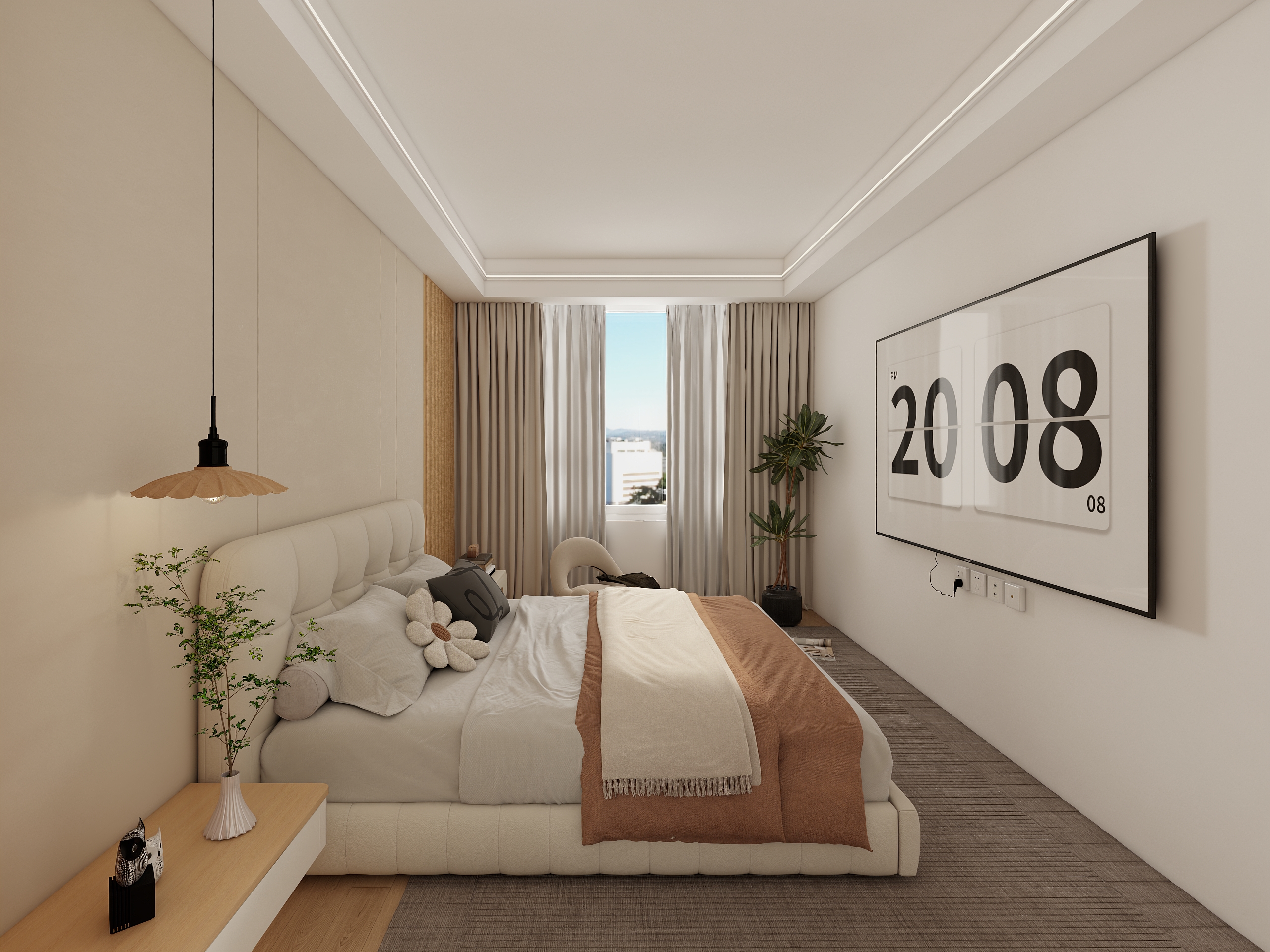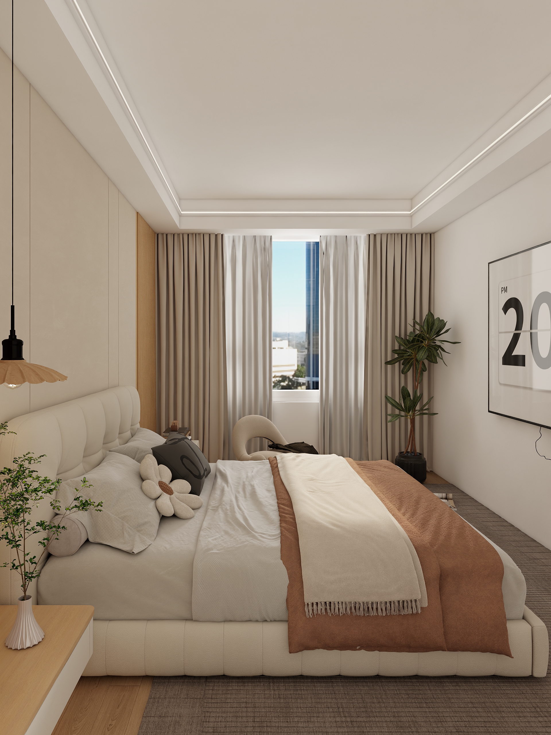 Transform your space with X-Bond’s multifunctional bedroom, featuring a built-in study desk with pegboard organizer, white wardrobe storage, and neutral bedding with black accents. Includes abstract wall art, natural light optimization, and space-saving solutions for urban living.