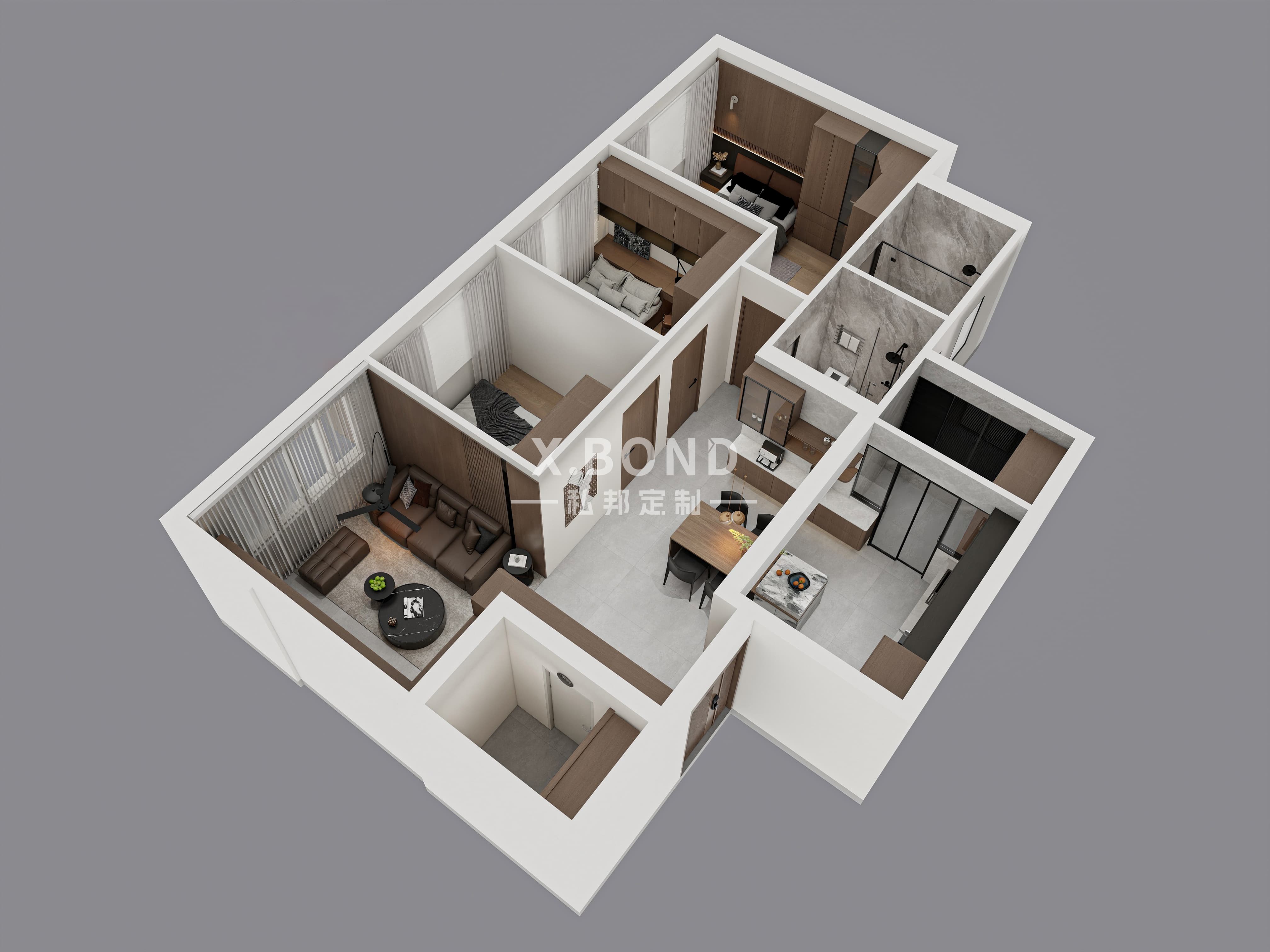This 4-room BTO showcases a modern Italian style with sleek dark wood, black accents, and warm lighting. It features a living room with a wooden feature wall, leather furniture, and a minimalist bedroom with integrated workstations. The kitchen combines dark cabinetry with marble, and custom storage walls with glass displays add sophistication.